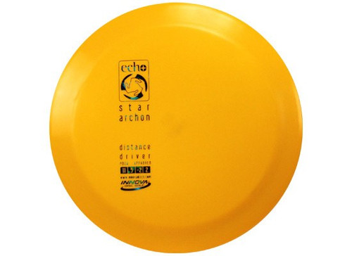 The Archon is an understable distance driver modeled after a worn-in Pro Wraith. It has great glide and will be controllable for a wide range of players from intermediate to pro. The secret is out about this disc's construction, and this is truly a Vulcan top with a Wraith wing. Beefy feel and straight, glidey flight -- sure to be a classic! The Echo material Archon should wear in slightly to become a straight-flying touch workhorse. Echo plastic, formerly known as EchoSTAR, is still the grippy earth-friendly fusion of Innova's high-end reprocessed plastics. Features: Innova Echo recycled Plastic Speed: 11 Glide: 5 High Speed Turn: -2 Low Speed Fade: +2